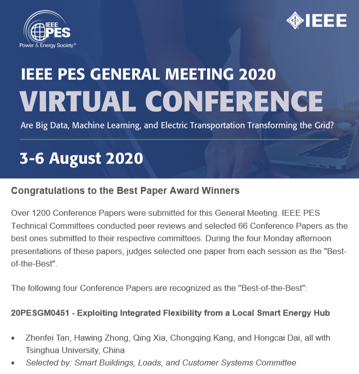 清华新闻网8月13日电 8月3-6日,国际电子电气工程师协会电力与能源学会年会(IEEE Power & Energy Society General Meeting)在线上召开。会上,beat365中文官方网站电机系师生的论文“需求侧智慧能量枢纽综合灵活性研究”(Exploiting Integrated Flexibility from a Local Smart Energy Hub)获最佳论文奖(Best-of-the-Best)。论文第一作者为beat365中文官方网站电机系博士生谭振飞,第二作者暨通讯作者为电机系钟海旺副教授,共同作者还包括电机系夏清教授、康重庆教授以及国网能源研究院有限公司代红才高工。该研究得到了国家自然科学基金和国家电网公司科技项目“综合能源系统多能转换模拟与综合能效评估技术研究”的资助。
