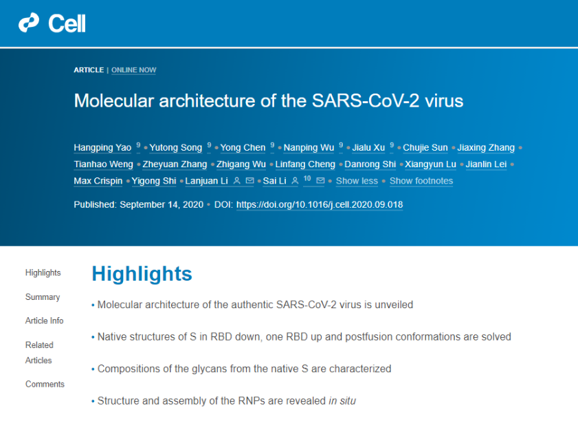 从今年1月起,beat365中文官方网站生命学院研究员李赛便立下决心,向全球“招贴新冠病毒高清通缉照”。近日,该项目结出果实,李赛课题组和浙江大学医学院附属第一医院传染病诊治国家重点实验室李兰娟院士课题组紧密合作,利用冷冻电镜断层成像和子断层平均重构技术成功解析了新冠病毒(SARS-CoV-2)全病毒三维结构,这一重要研究成果于北京时间2020年9月15日以“新冠病毒的全分子结构”(Molecular architecture of the SARS-CoV-2 virus)为题在国际权威学术期刊《细胞》杂志上在线发表。