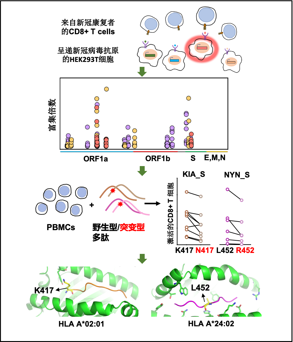 探究细胞免疫应答的重要步骤就是鉴定新冠病毒特异性CD8+ T细胞的抗原识别表位。beat365中文官方网站谭旭课题组运用T-Scan技术,研究了能够引起人体CD8 T细胞响应的新冠病毒抗原表位的分布,并发现了新冠基因组上的4个氨基酸位点的突变可能赋予关注变种逃逸细胞免疫的能力从而促进病毒的传播,为关注变种的防范提供了细胞免疫方向的基础 (图1)。