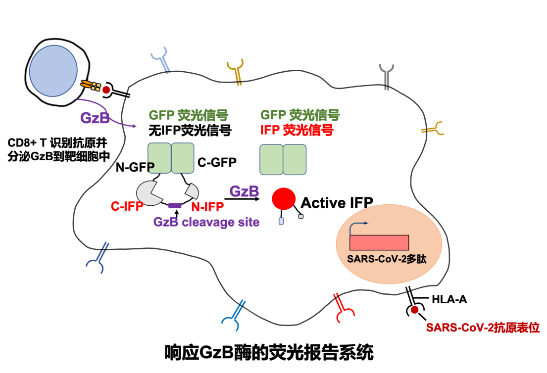 T-Scan技术是2019年由美国哈佛大学医学院斯蒂芬·埃利奇(Stephen Elledge)教授发明的用于识别T细胞抗原的高通量筛选平台。运用T-Scan技术构建新冠病毒抗原呈递的靶细胞文库的原理(如图1所示)。首先运用DNA芯片大规模合成技术,合成覆盖新冠病毒编码的所有蛋白的多肽基因序列,每个多肽56氨基酸,一共有9179条序列。之后使用慢病毒载体将新冠病毒多肽抗原的基因文库转达到靶细胞中,在靶细胞内进行多肽抗原基因的表达和多肽抗原的内源性加工最终由靶细胞的主要组织相容性复合体(MHC)分子将新冠病毒抗原呈递到细胞表面,较好地模拟了细胞被病毒感染后将病毒抗原呈递到细胞表面的过程。此外,靶细胞还携带响应颗粒酶B(Granzyme B, GzB)活性的IFP荧光报告基因(图3),用于筛选被CD8+ T细胞识别的靶细胞。GzB是一种丝氨酸蛋白酶,平时储存在CD8+ T细胞内的细胞毒性颗粒中,当CD8+ T细胞识别靶细胞呈递的病毒抗原后被活化,CD8+ T开始执行杀伤功能,通过穿孔素在细胞膜上形成孔洞将装载GzB的细胞毒性颗粒特异性分泌到靶细胞中。GzB进入靶细胞后激活IFP荧光报告基因。接下来可以通过流式筛选富集被识别的靶细胞,并通过下一代测序鉴定靶细胞呈递的抗原序列。
