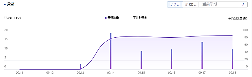 根据荷塘雨课堂的统计数据,正式上课第一周,电机系所有课堂平均到课率稳定在较高水平。到课率未达100%的主要原因是到教室上课的线下学生并未全部登录雨课堂上课或者课后回看,雨课堂保持较高的活跃度。