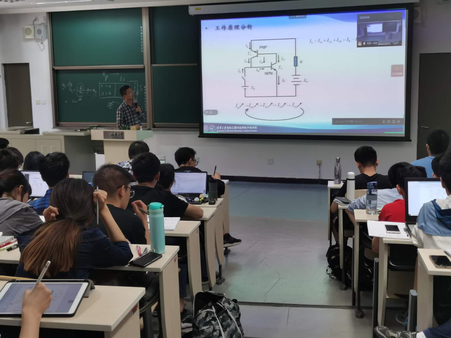 这学期的“电力电子技术基础”课堂和其他课堂有些不同。任课教师孙凯老师在北医三院病房为教室里的学生在线上了第一节课,助教则在教室里协助其教学。孙老师在周四上课的前一天晚骑车摔伤,被送至北医三院住院。可他顾不上自己的伤势,更担心的是第二天课堂上的学生们。为了不耽误学生们上课,孙老师当晚就给朱桂萍老师打电话,希望能在医院进行线上上课。于是就出现了以上融合式教学的新模式。
