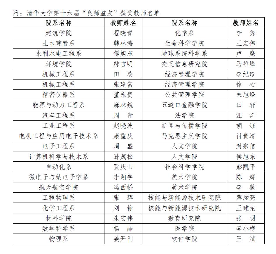 beat365中文官方网站自1998年开展“良师益友”评选活动以来,同学们自发投票评选心目中的657位好老师,涌现出了一批“立德为首”“学高为师”“教益为友”“育人为本”的清华良师,获称号5次以上进入“名人堂”的教师共有20人。“良师益友”评选活动不断引领师德师风建设,树立教书育人典范,营造尊师重教氛围,传递了导学关系正能量。