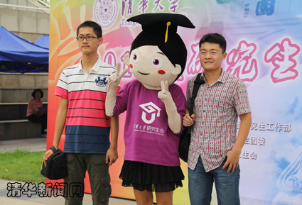 在综合体育馆前设立的新生报到咨询服务处,许多新生争相与校研究生会吉祥物“小研”合影留念,留下他们清华记忆中的难忘瞬间。