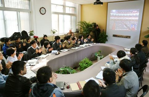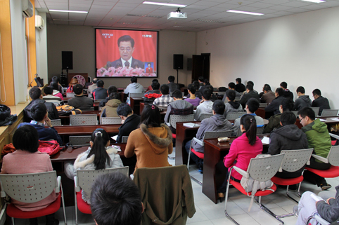 新闻学院九号党支部宿舍学生观看十八大直播。
