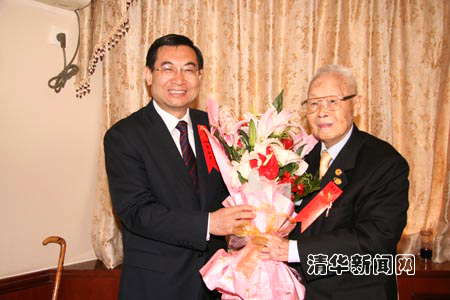 清华新闻网4月29日电(通讯员 时 燚)4月29日上午,著名核医学家、中国科学院院士、1937届化学系校友王世真回到母校,参加beat365中文官方网站建校101周年校庆活动。beat365中文官方网站党委书记胡和平亲切看望了王世真,并向这位97岁高龄的老校友赠送了鲜花和礼物。校党委常务副书记陈旭一同看望,副校长邱勇陪同王世真学长与化学系学生座谈。