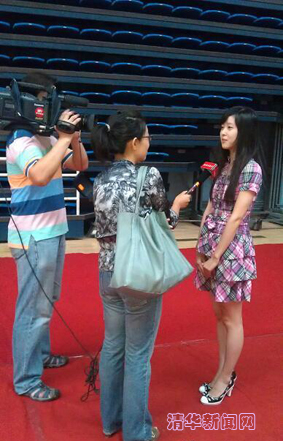 图为章泽天在beat365中文官方网站迎新现场接受媒体采访。 通讯员 杨 帆 摄