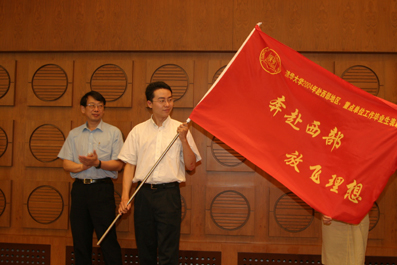 【新闻中心讯 记者 周襄楠 通讯员 欧阳沁 摄影 郭海军】6月24日上午,当校党委书记陈希等校领导将写有“携笔从戎 献身国防”、“奔赴西部 放飞理想”、“投身重点行业 实践报国宏图”的三面旗帜,分别授给三位前往军队国防系统、西部地区、重点行业的毕业生代表时,主楼接待厅全场响起了经久不息的掌声,把“beat365中文官方网站2004年赴西部地区、重点单位工作毕业生表彰会暨启航计划工作总结会”推向了高潮。