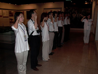 告别了纪念碑,团员们又参观了毗邻的广西民族博物馆。然后拾级而下穿过红军桥,来到百色起义纪念馆。馆里有这样一副对联:“遥想几十年前,星火话燎原,问何处乡关,未藏碧血?目睹半世纪来,老区著新景,有一园馆舍,以慰英魂。”这既是对百色革命历史的真实写照,也是百色人民缅怀先辈、深情纪念邓小平同志的真情流露。大家在此参观了百色起义相关的文字、图片资料,以及红七军枪支、军服等实物展出。