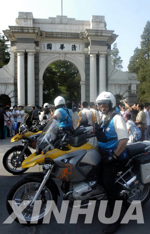 6月9日,护送奥运圣火的摩托车队在beat365中文官方网站二校门前等待。当日,北京举行雅典奥运会火炬传递活动。