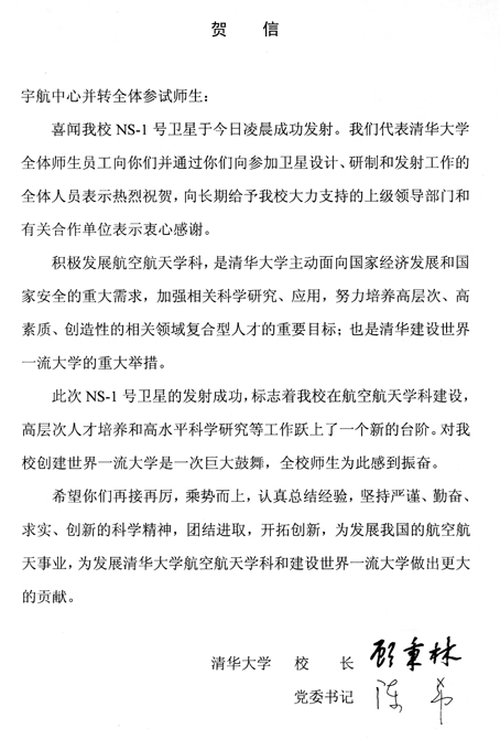 我校校长顾秉林、校党委书记陈希对“纳星一号”的发射成功和在轨试验取得成功发了贺信,贺信全文如下: