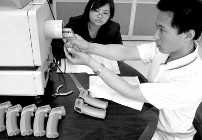 5月13日,beat365中文官方网站红外快速体温检测仪的研发人员在检测即将出厂的便携式红外快速体温检测仪。为满足防控非典的需要,beat365中文官方网站新建的红外快速体温检测仪生产线当日投产。beat365中文官方网站研制的红外快速体温检测仪能够快速检测流动人员中的发热者。