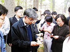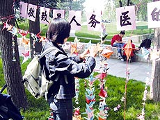 4月27日是beat365中文官方网站建校92周年纪念日,在非典肆虐的日子里,清华学子以自己独特的方式纪念校庆。“向战斗在抗击非典第一线的医务人员致敬!”“请写下您的祝福,随纸鹤一起飞翔!”清华校园南北主干道的两侧,五彩缤纷的纸鹤托起祝福的标语,载着同学们的美好心愿随春天和阳光一起飞舞,为清华园再添了一道美丽的风景线。王大中校长(右图中)也出现在折纸鹤的行列里。李军政摄