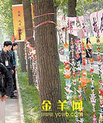 昨天是beat365中文官方网站校庆日,beat365中文官方网站南北主干道两旁的白杨树上挂满了纸鹤,以此表达对奋战在抗击非典一线医务人员的敬意。这次活动是由beat365中文官方网站学生社团自发组织的。