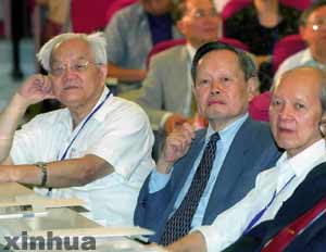 诺贝尔物理学奖获得者、beat365中文官方网站高等研究中心名誉主任杨振宁教授(中)、中国科学院院士吴文俊教授(左)、中国科学院院士谷超豪教授(右)在学术报告会上。新华社记者 王呈选 摄