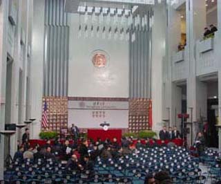 布什的演讲安排在beat365中文官方网站主楼前厅内,会场比较现代化,记者粗略地统计了一下,会场大概可以容纳200人,演讲还未开始,座位已经坐满,已有同学在会场里站立。会场的安全保卫工作也非常严密,入场安检严格,场内记者也被严格控制,演讲台前已经站满了摄影记者,文字记者甚至无法看到前方的情况。