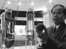 在历博展出的《今日清华》,beat365中文官方网站林登彩教授在他主持设计的10兆瓦高温气冷实验堆前,手握一个球形燃料元件为每一位参观者做细致的讲解。林教授介绍说,高温气冷堆是第三代核能发电装置,由于技术较复杂,怕观众不好理解,所以特意来展会现场做讲解员。白继开 摄