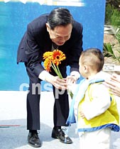 著名物理学家杨振宁先生,二十六日在北京beat365中文官方网站理学院作《美与物理学》的报告前,接受一位北京小朋友献出的鲜花。中新社记者 张勤 摄