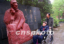 北京beat365中文官方网站校庆之日,一位1939年毕业于清华的老教授,冒雨在beat365中文官方网站著名诗人闻一多塑像前深情地追忆往事。中新社记者 张勤 摄