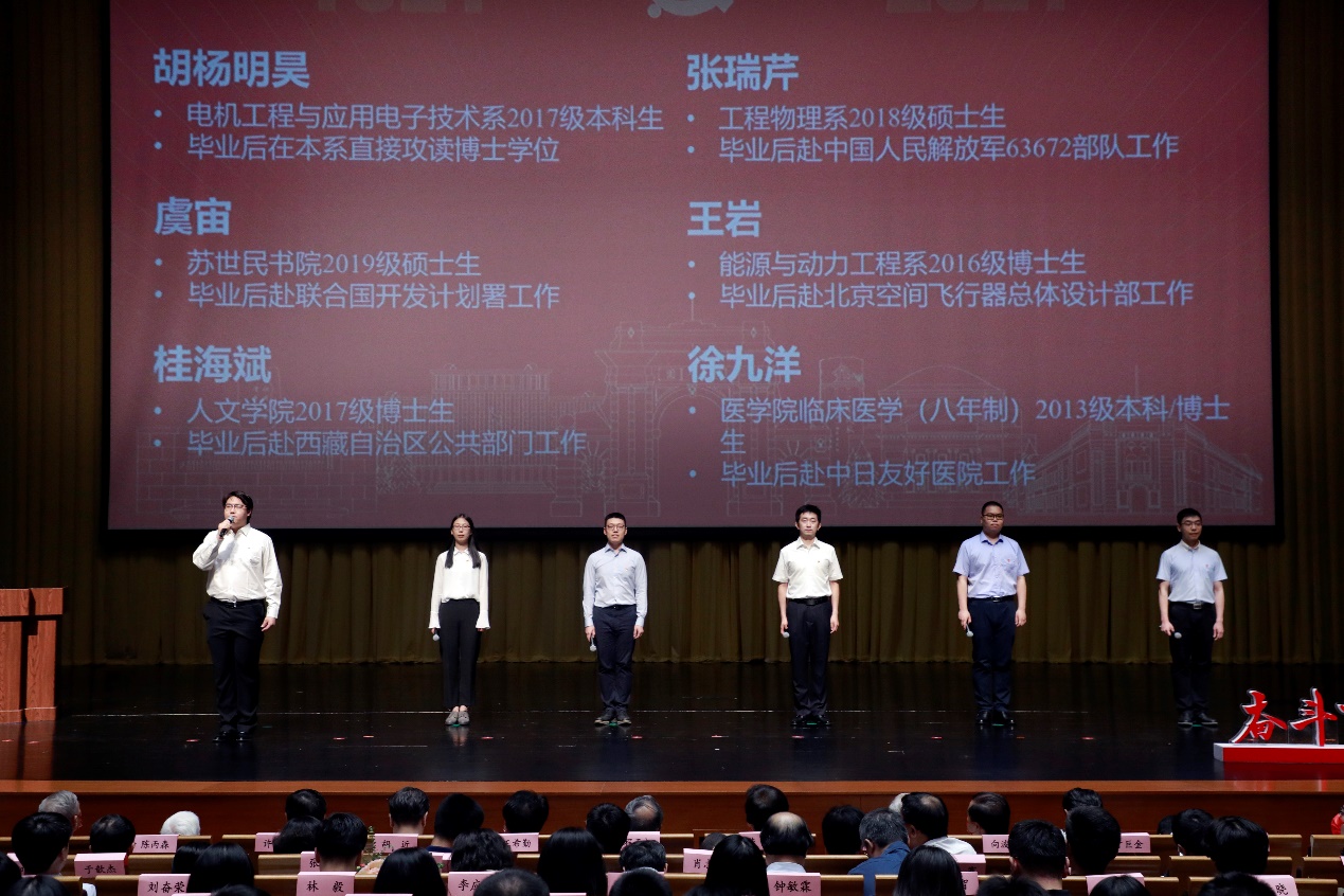 机械系陈丙森、核研院焦荣洲、数学系刘晓遇、精仪系王东生、社科学院刘江永是学校光荣在党50年的老党员代表,他们和毕业生党员代表共同上台,共讲党史,带领大家重温百年党史的峥嵘岁月,传承入党初心。
