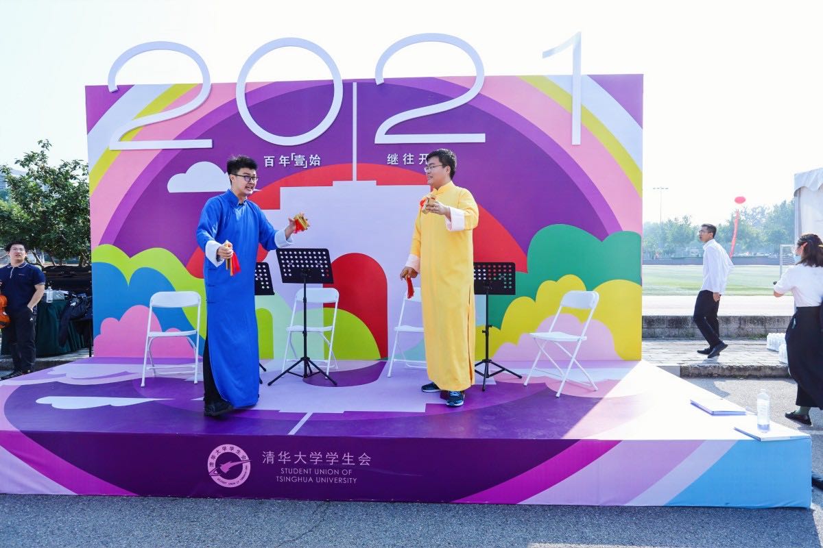 迎新现场,以“百年‘壹’始,继往开来”为主题的迎新活动丰富多彩:舞台上艺术团用精彩的表演欢迎新同学;合影台上,大家拿起“行胜于言”“自强不息,厚德载物”“2021清华我来啦”等手持合影板争相拍照,留下自己初入清华的宝贵瞬间;心愿墙上,新的“一字班”一笔一画写下心愿与志向,贴成“2021”的字样;现场准备的建党百年主题学习卡吸引不少同学驻足,大家拿起图文并茂的趣味卡片学习百年党史,感受清华红色传统。