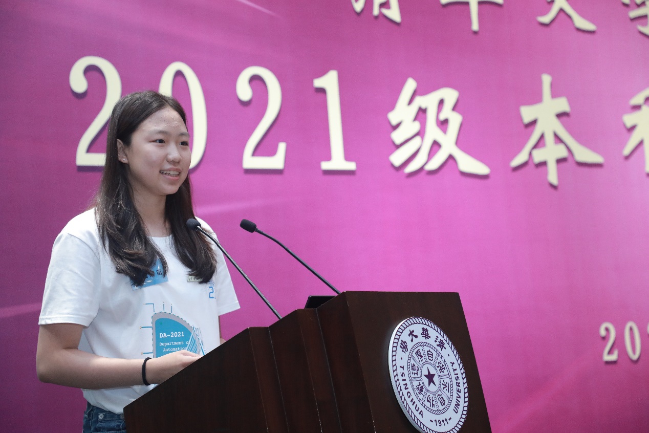 自15班学生戚琬笛作为新生代表上台发言。她从新生的视角表达了自己对大学生活的期待和对时代责任的理解,并结合自身体育特长的分享了自己对“无体育,不清华”精神的认识。