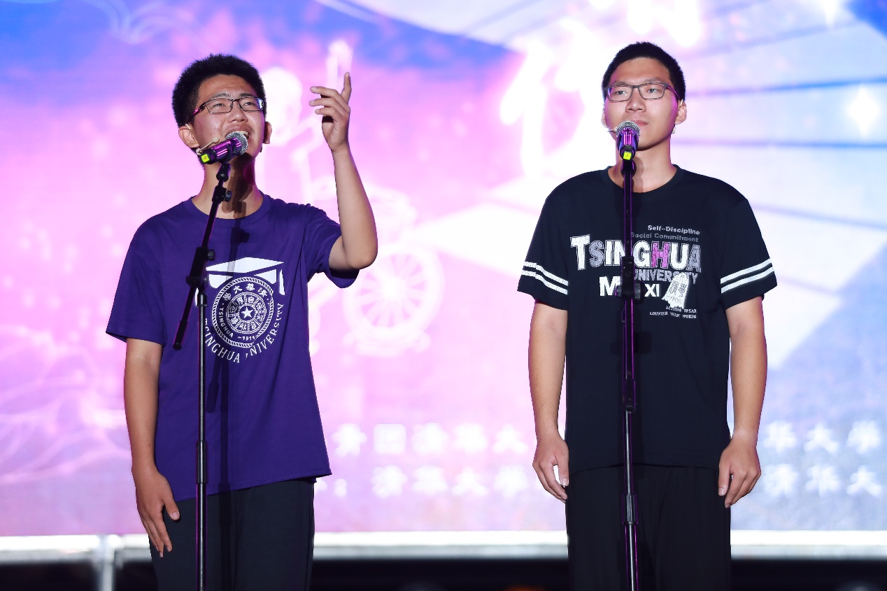 第二篇章“天行健正清华”,展现了清华园百十年来的深厚积淀和人文日新的美育成果。魔术《指尖清华园》和相声《清华之最》,在轻松愉快的氛围中带大家领略了清华生活的无限可能;原创歌曲《心光·时光》抒发了清华学子对成长和时代的心声;话剧《我想在清华做的100件事》饱含着清华人规划未来人生蓝图时的美好憧憬。迎新特别节目还邀请到了2020年“清韵烛光”获奖教师代表牟鹏、陈海昕、杨大文、刘慧凝四位教师,为即将开启大学生涯的一字班新生寄语。