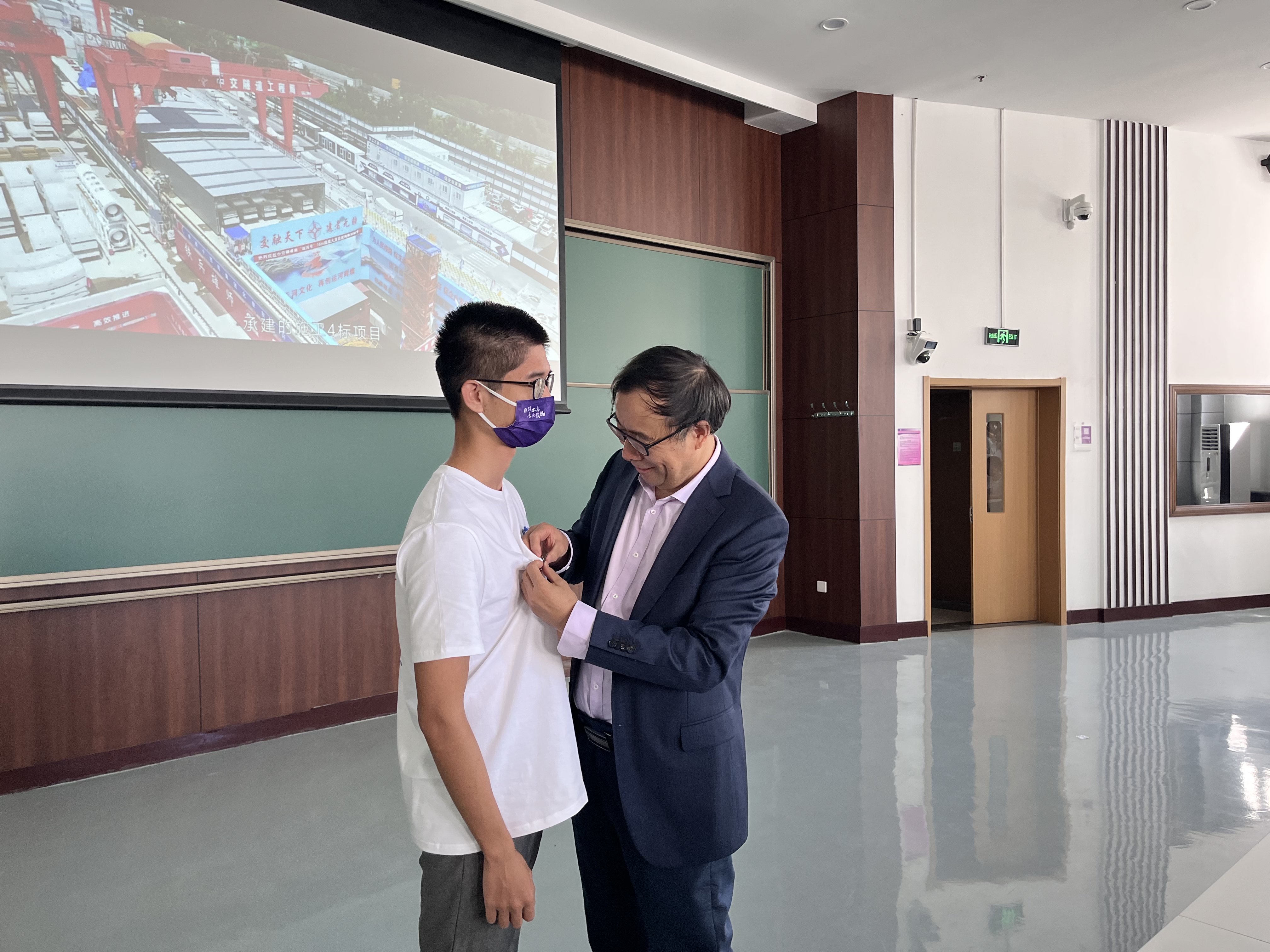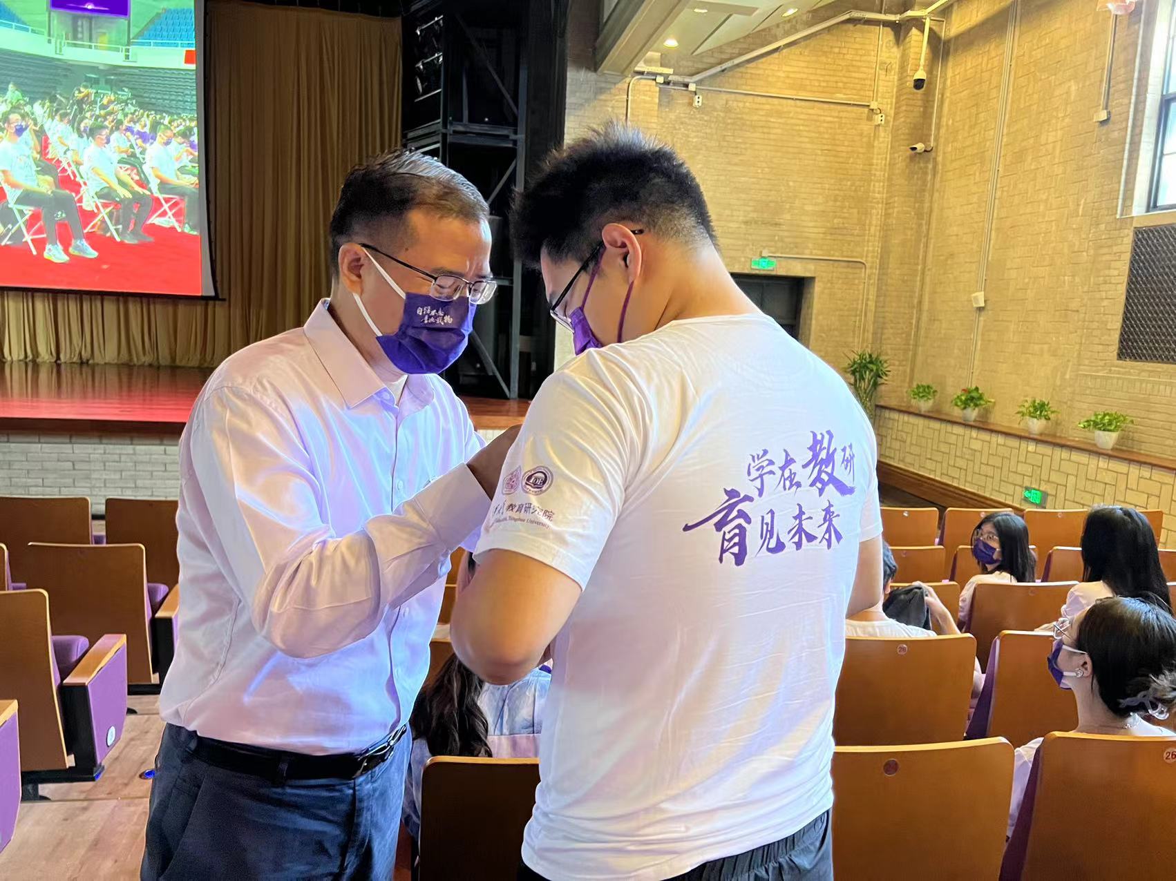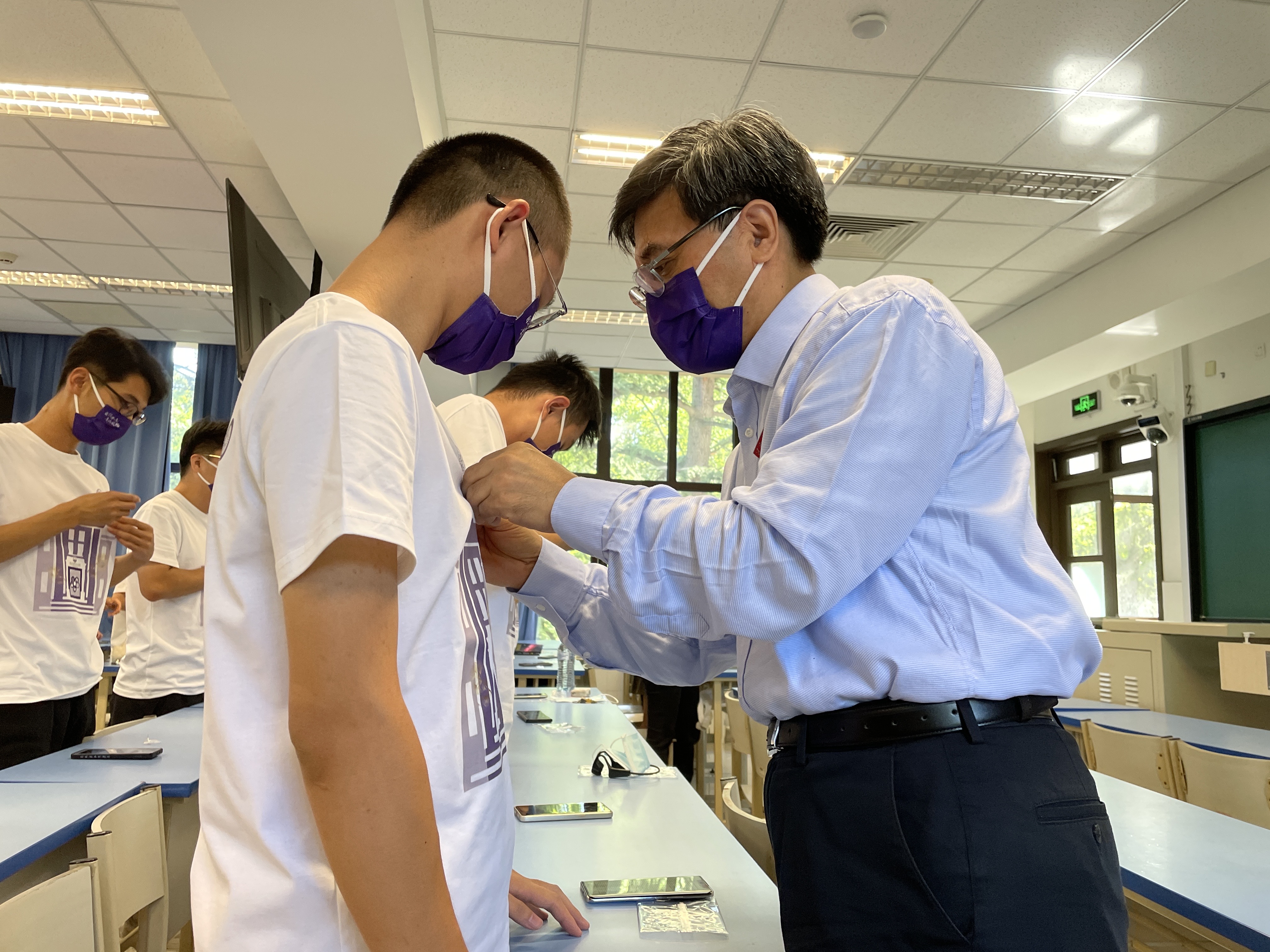 敬爱的老师为新生佩戴校徽