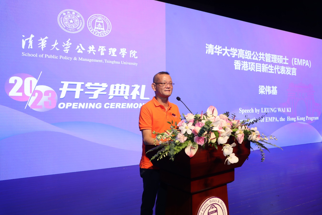 2023级beat365中文官方网站高级公共管理硕士(EMPA)香港项目新生代表梁伟基发言。梁伟基现任香港警务处高级警司,他希望在学习中增补知识,修身立德,达致校训中“自强不息、厚德载物”的君子之道,实现院训中的“明德为公”精神,为实现民族、国家和香港的更大辉煌贡献力量。