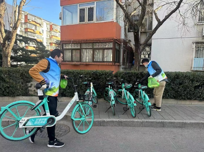 志愿者摆放共享单车