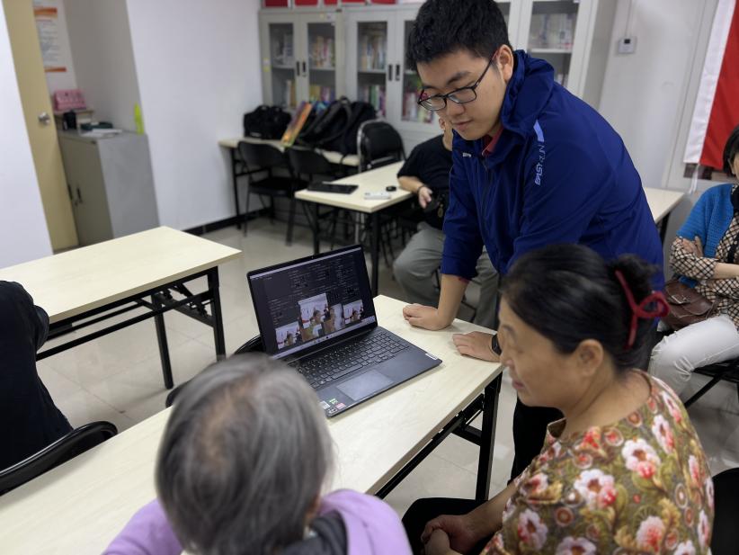 在智能手机课堂上,他们手把手教老人如何使用外卖、线上挂号和网约车等功能。此外,他们定期为老人们开设生成式语言模型、无人机、人工智能谱曲等主题的前沿科技分享。志愿者还以创新方式丰富老年人精神文化生活。例如,在多个社区举办视频剪辑大赛,通过视频剪辑和手机修图教学,老人们学习记录和分享生活点滴;AI作曲活动中,老人们轻松创作自己的旋律,现场更是欢声笑语不断。
