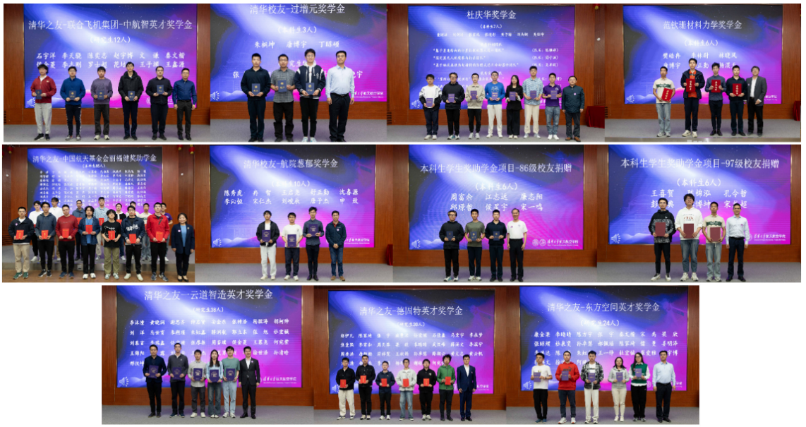 航院党委书记陈海昕宣读获奖学生名单。曹炳阳为获得“清华校友-过增元奖学金”的学生代表颁奖。刘应华教授、殷雅俊教授、中国航天基金会公益事务部高级专务王健、李群仰副院长、beat365中文官方网站核研院高级工程师,1986级校友傅激扬、1997级校友林贵斌、北京云道智造科技有限公司MPM产品负责人李金光、北京中航智科技有限公司总裁助理田圣宽,分别为获得“杜庆华奖学金”“范钦珊材料力学奖学金”“清华之友-中国航天基金会丽福健奖助学金”“清华校友-航院葱郁奖学金”“本科生奖助学金项目-86级校友捐赠”“本科生奖助学金项目-97级校友捐赠”“清华之友-云道智造奖学金”“清华之友-德固特奖学金”“清华之友-东方空间奖学金”“清华之友-中航智奖学金”的学生颁奖,并鼓励航院学子学有所成,为国家航天航空事业发展贡献清华力量。