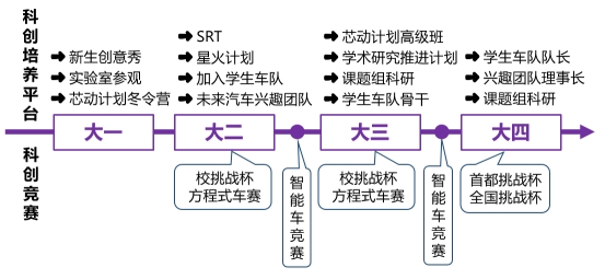 车辆学院整体形成了学生科技人才培养全过程闭环。大一同学可以通过参加新生创意秀、实验室参观和芯动计划等迅速提升知识水平,建立科研科创的信心和兴趣。大二同学可以在对科创有所了解之后参加挑战杯、SRT、星火计划、三大车队和智能车大赛等。大三同学具备了更多的专业知识后可以参加挑战杯、SRT、暑期研修、学推计划或是进入课题组继续学习。大四时许多同学已经开始从科创走向了科研,进入各个课题组进行科研、成为车队技术骨干或继续备战全国挑战杯。学生依托科创培养平台和科创竞赛,逐步增强自身科创能力,服务于向研究生等阶段的过渡;同时,也在高年级时成为学生车队和兴趣团队的骨干,带动低年级学生的科创入门和培养。