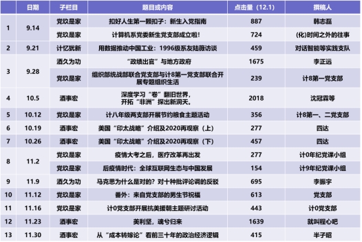 党建工作是育人工作的基本抓手。“红星计划”通过定期开展学生组读书分享会与理论交流会,强化“双肩挑”辅导员与德育工作助理的自身理论水平。为进一步将思想引领辐射到全系同学,在院系党委学生组的指导下,计算机系TMS协会2020年3月30日在官方公众号上线“深度学习”理论专栏,分为时事评论、组织生活、基层实践、经典学习、党史回忆、联合党建6个子栏目。该品牌专栏一经上线,就因其浓郁的院系特色和紧随时事热点深受同学好评,成为计算机系日常运营的本科生特色党建品牌。