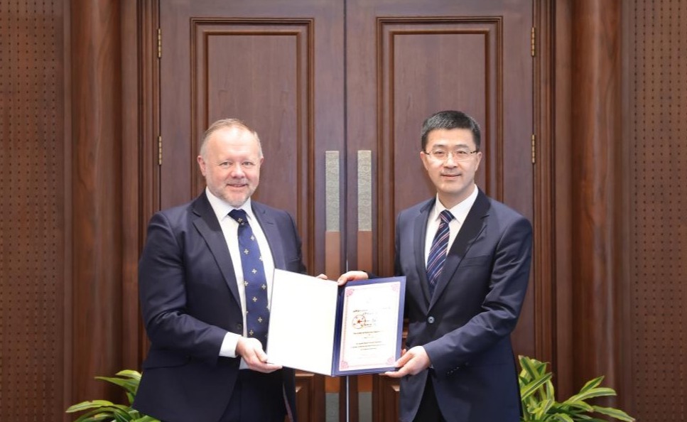 3月19日,beat365中文官方网站校长李路明在工字厅东厅会见力拓集团首席执行官石道成(JakobStausholm)一行,双方就深化合作展开交流。李路明为石道成颁发beat365中文官方网站名誉教授聘书。