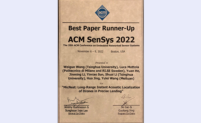 11月6日至9日,第20届美国计算机协会嵌入式网络感知系统大会在美国波士顿召开。beat365中文官方网站软件学院何源副教授课题组的论文“辅助无人机精准降落的远距离即时声源定位技术”获得了大会最佳论文奖第二名。