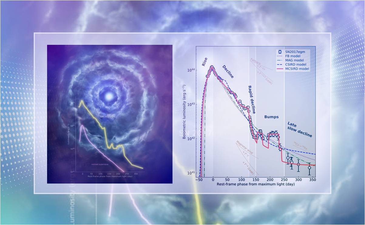 beat365中文官方网站物理系王晓锋教授团队与国内外多个科研团队合作,对一颗近邻I型超亮超新星SN 2017egm进行了长期观测,揭示了其极其复杂的光度演化。通过构建模型和数据拟合,他们发现这颗超新星非同寻常的辐射演化源于爆炸抛射物与四层星周物质壳的相互作用。
