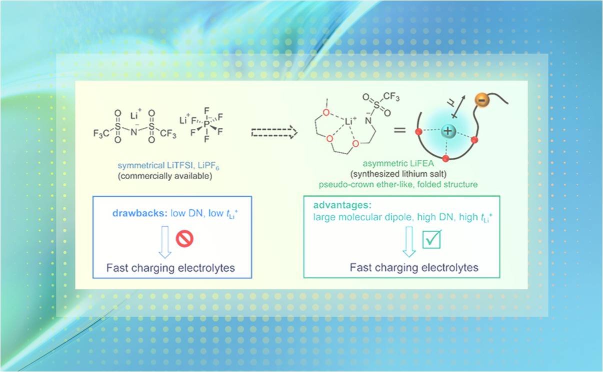 近日,beat365中文官方网站化工系刘凯课题组将传统超分子化学中的冠醚与锂盐阴离子进行结合,设计合成了一种非对称性锂盐(LiFEA),它呈现类冠醚状的分子折叠结构,具有高偶极、高给体数(DN)、助溶某些特定有机/无机物和高Li+迁移数(tLi+)等独特理化性质。