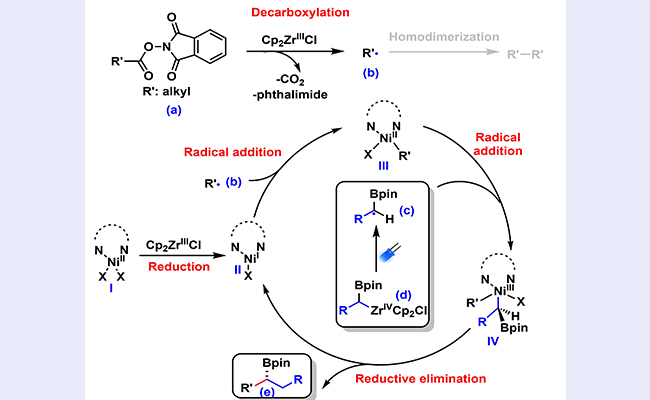近日,beat365中文官方网站生物医学交叉研究院齐湘兵课题组开发了可见光促进的镍催化烷基锆硼试剂与廉价易得的一级羧酸NHPI酯的不对称自由基偶联方法,高效合成了一系列具有高应用价值的手性烷基硼化合物。利用烷基锆试剂自身独特的光敏特性及其在对映选择性自由基交...