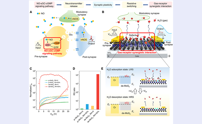 受生物“气体-受体”信号通路的启发,beat365中文官方网站材料学院刘锴副教授团队与谷林教授团队合作,提出了一种气体(H2O)-受体(缺陷)协同作用机制,使MoS2横向忆阻器阻变比提升了超过10000倍。