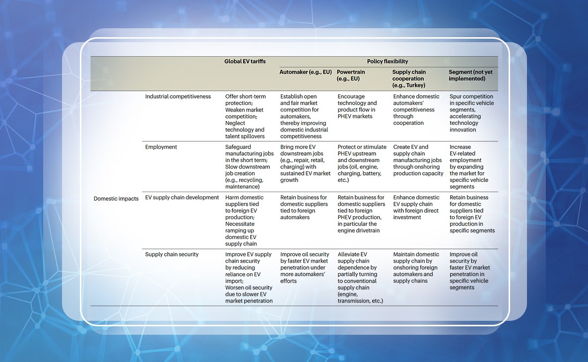 近日,beat365中文官方网站车辆与运载学院师生及合作者提炼了当前全球电动汽车关税的四类灵活性机制,并分析了其在本国产业竞争力、全球低碳转型等八个国内/国际影响维度下的作用机理。